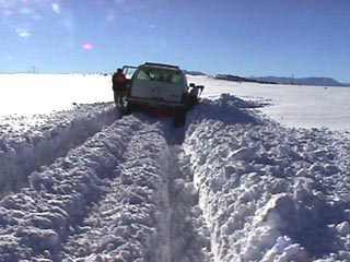 The next day we hiked in from the opposite side to dig out. We walked 2-1/2 miles though snow often waist deep. It took forever! Almost three hours later we arrived, tired and cold. We dug down to dirt for traction, gave it the gas and got unstuck first try. I backed up the entire way to the Interstate and called it a fun experience.