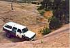The jeep and zuki didn't have much of a problem, they also hit bumpers. Pat, in his classic bronco, gave us the best show. His angle was just a little different than ours and he wound up dropping his right front tire into the crack, picking up his left rear high! We put a little weight on the bumper and he pulled across... he did have that tipsy feeling.